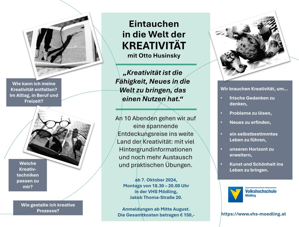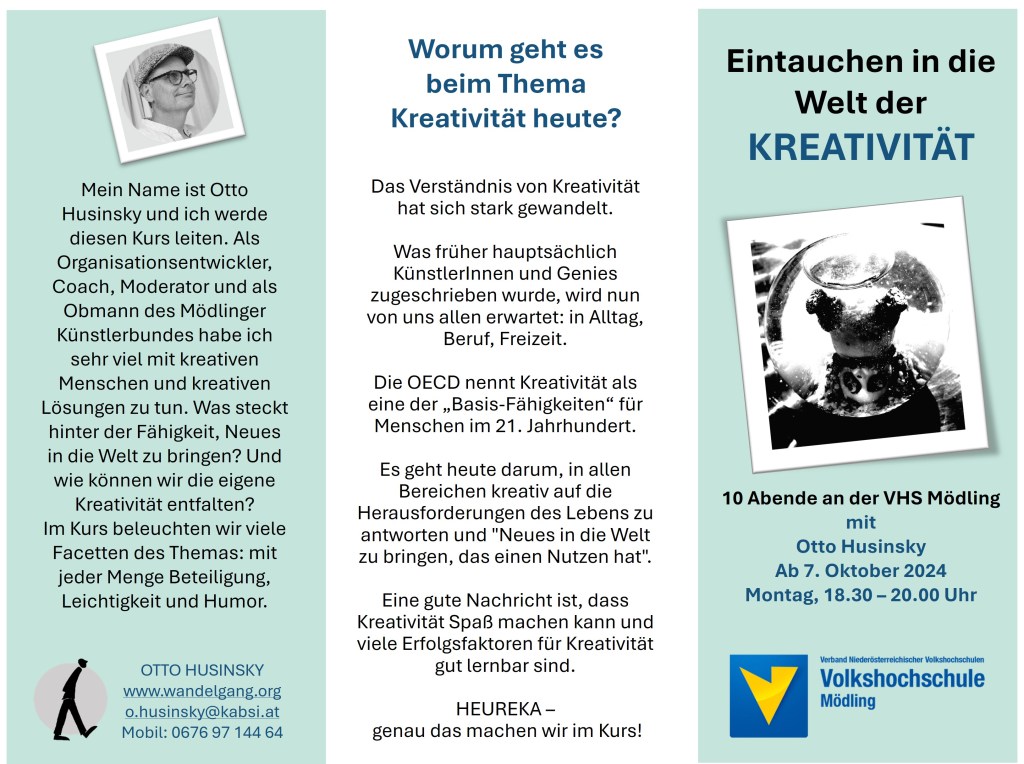 Ab 7. Oktober 2024 halte ich eine Mini-Workshopreihe (á 90 Minuten) an der VHS Mödling (Jakob Thoma Straße 20, 2340 Mödling). Jeweils am Montag von 18.30 Uhr bis 20.00 Uhr. Hier sind die Infos dazu: